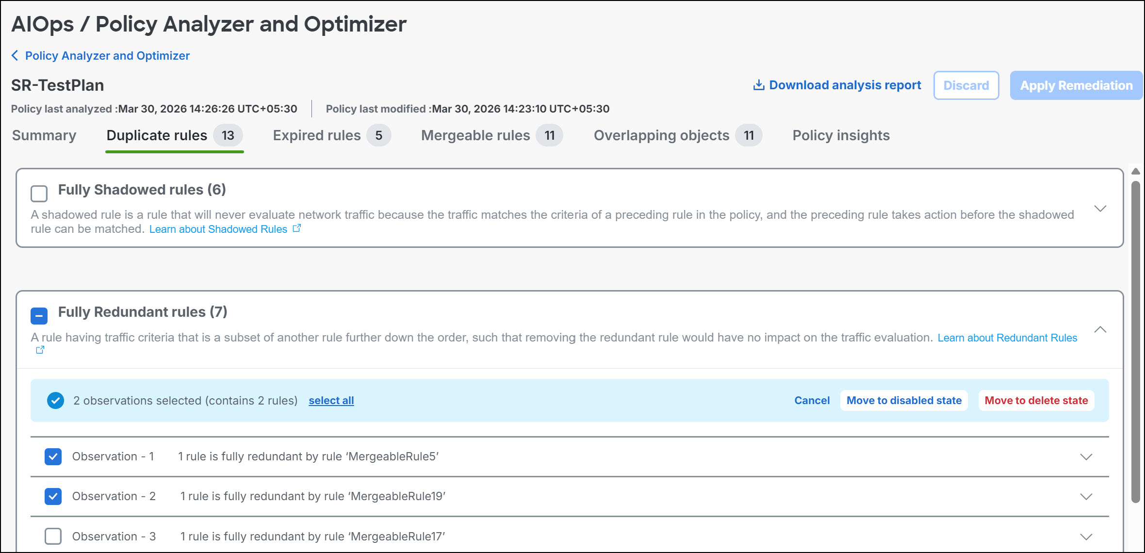 After you stage the selected duplicate-rule remediations, you can still Undo them before clicking Apply Remediation. It is recommended that you disable rules first to measure the impact and delete them later, because deleting them permanently removes them.