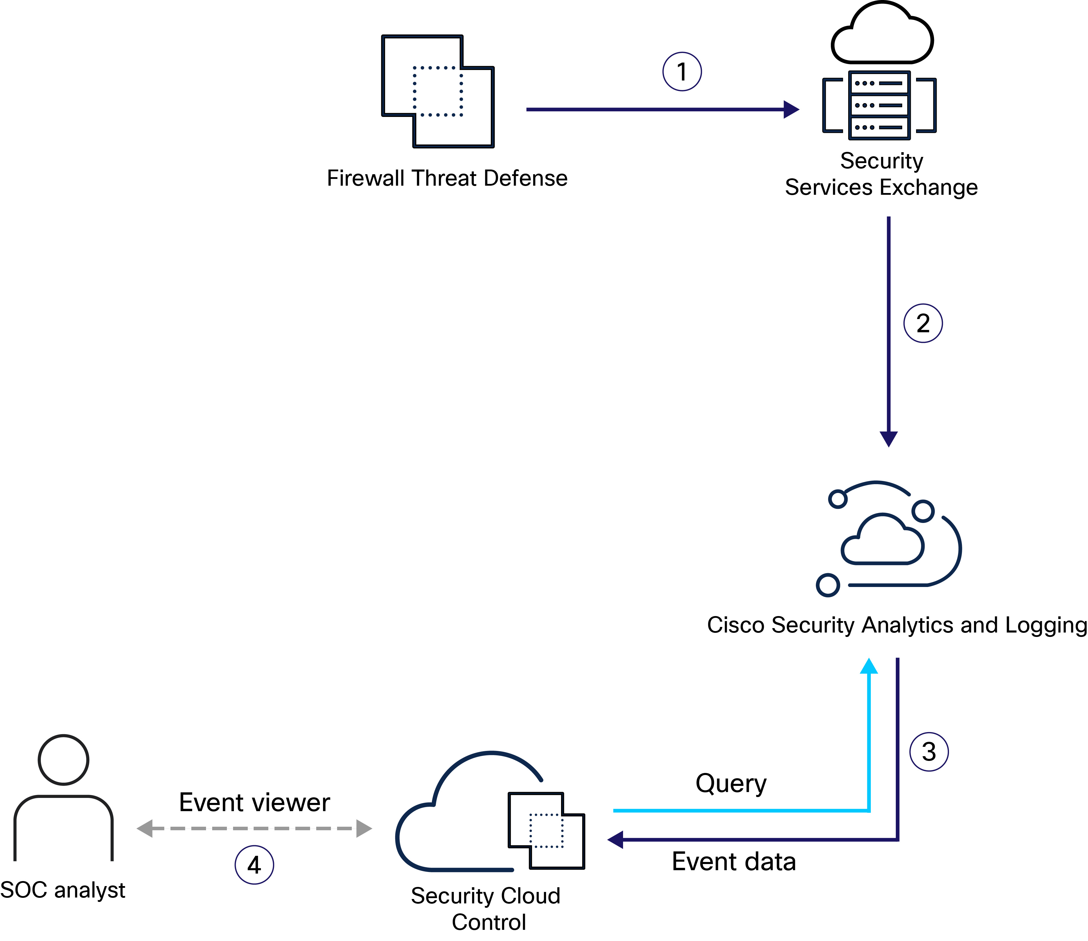 Security Services Exchange aggregates the event data from all the Firewall Threat Defense devices, converts it to JSON format, and sends it to Security Analytics and Logging for storage. |